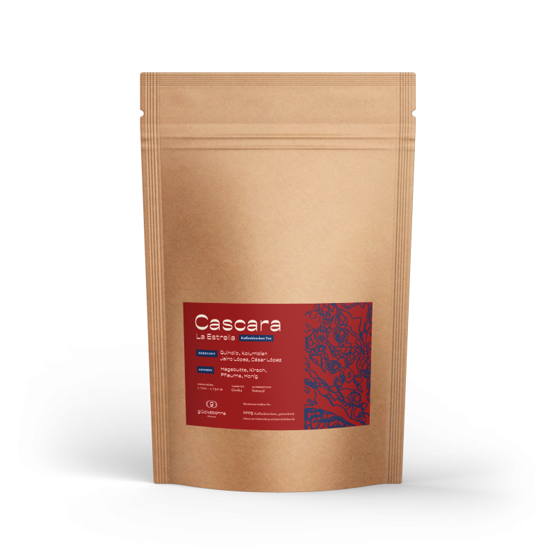 Unser Cascara stammt von der Farm La Estrella im kolumbianischen Quindío und wird aus der Pulpe der edlen Gesha-Kaffeekirsche gewonnen. Die Schalen werden nach einer kontrollierten Fermentation (pH-, Brix- und Mostkontrolle) schonend auf afrikanischen Trockenbetten getrocknet.